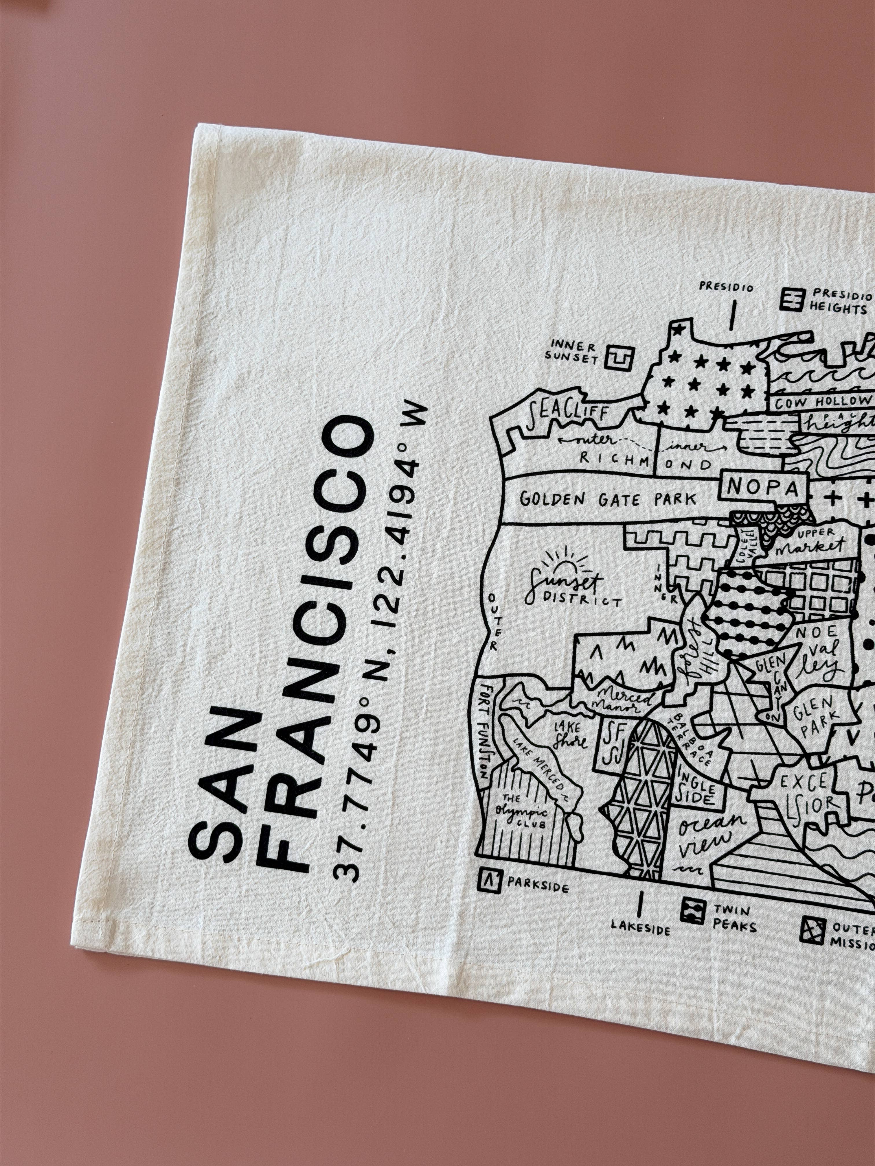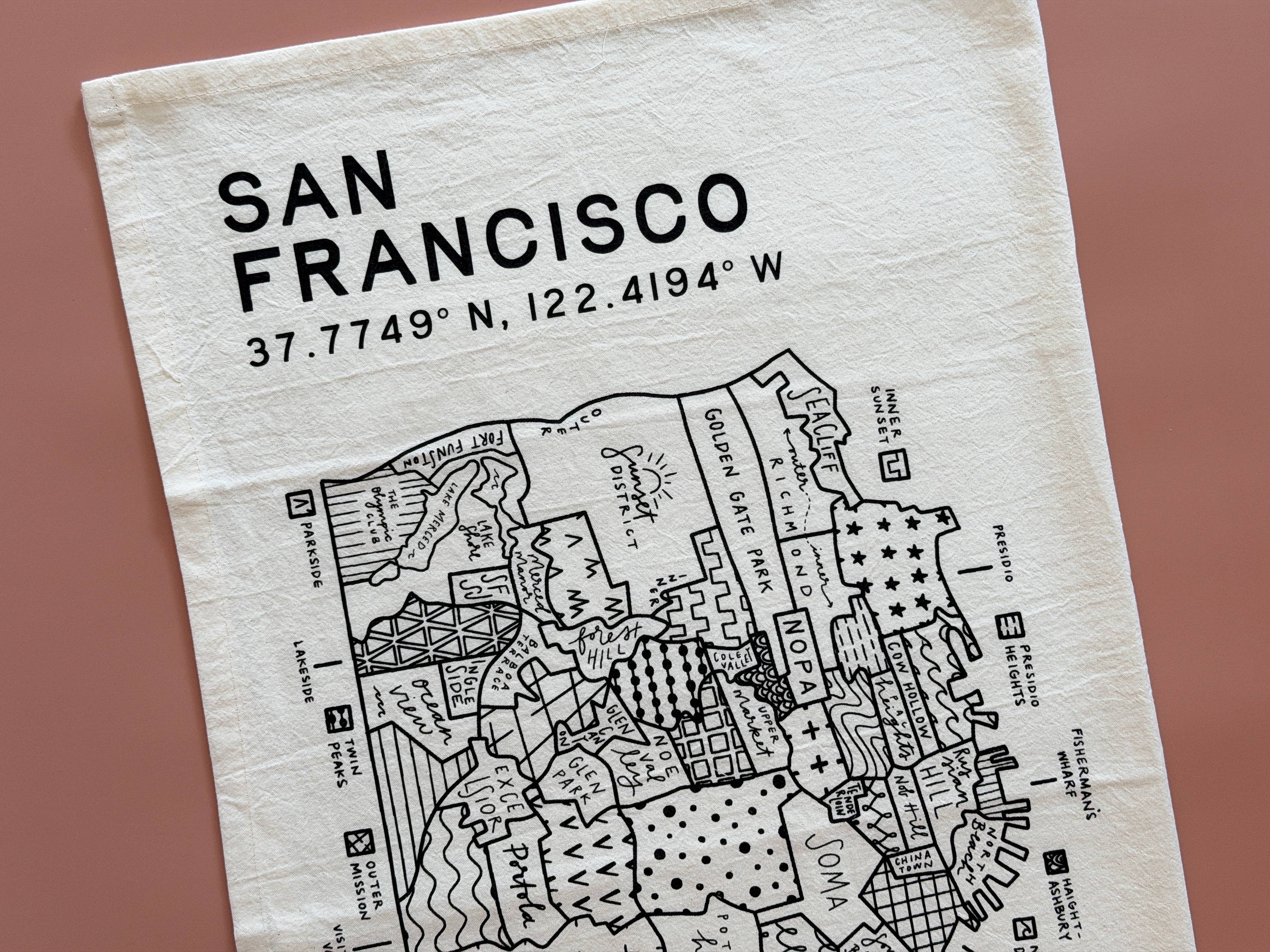 Bring personality to your kitchen with our screen printed tea towels featuring Aleisha's hand-illustrated map designs. Use to dry dishes, wrap a gift, line a basket full of bread, or simply put on display to start a conversation about your favorite place.