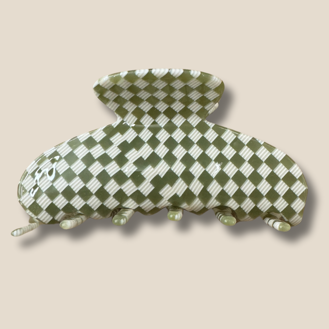A timeless essential with a modern edge. This classic hair clip in olive and white checker acetate is perfect for everyday wear. Its versatile design complements any look, offering a secure hold while adding a touch of understated style to your hair. Ideal for all hair types, it’s a go-to accessory you'll reach for again and again.