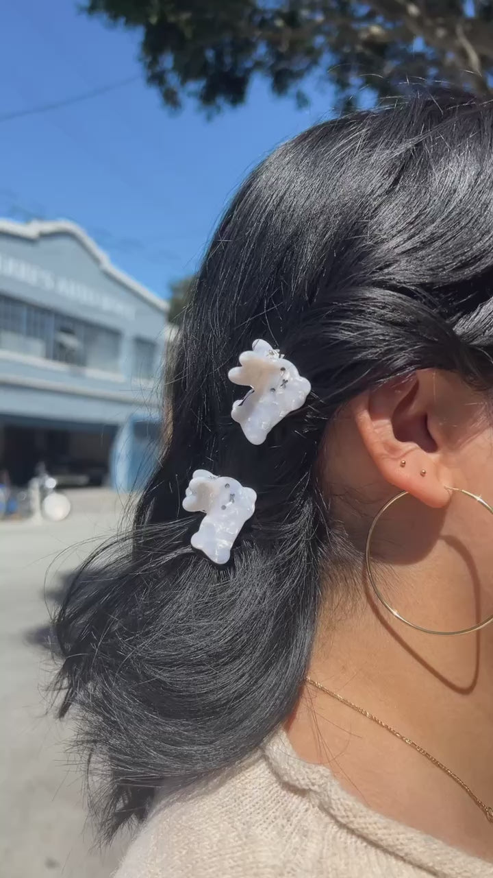 Made from ivory marbled cellulose acetate, this high quality durable hair claw is both functional and stylish. Perfect for adding a touch of whimsy to any hairstyle.