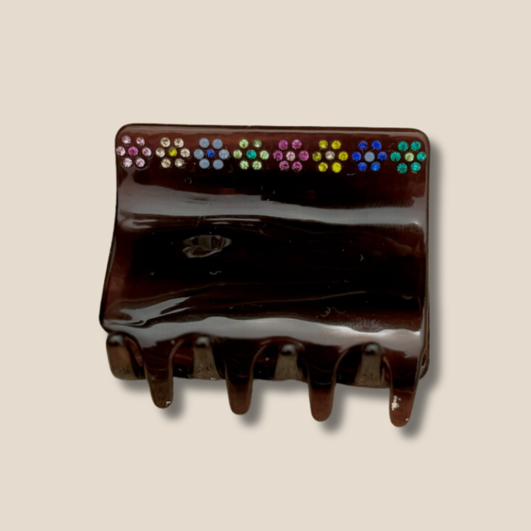 An absolute must-have with a playful twist. This small hair clip adds a pop of personality to any look, featuring a classic tortoise print and vibrant rhinestone flower accents along the edge. Ideal for shorter to medium hair lengths or half up-dos.Holds your style with ease and flair.