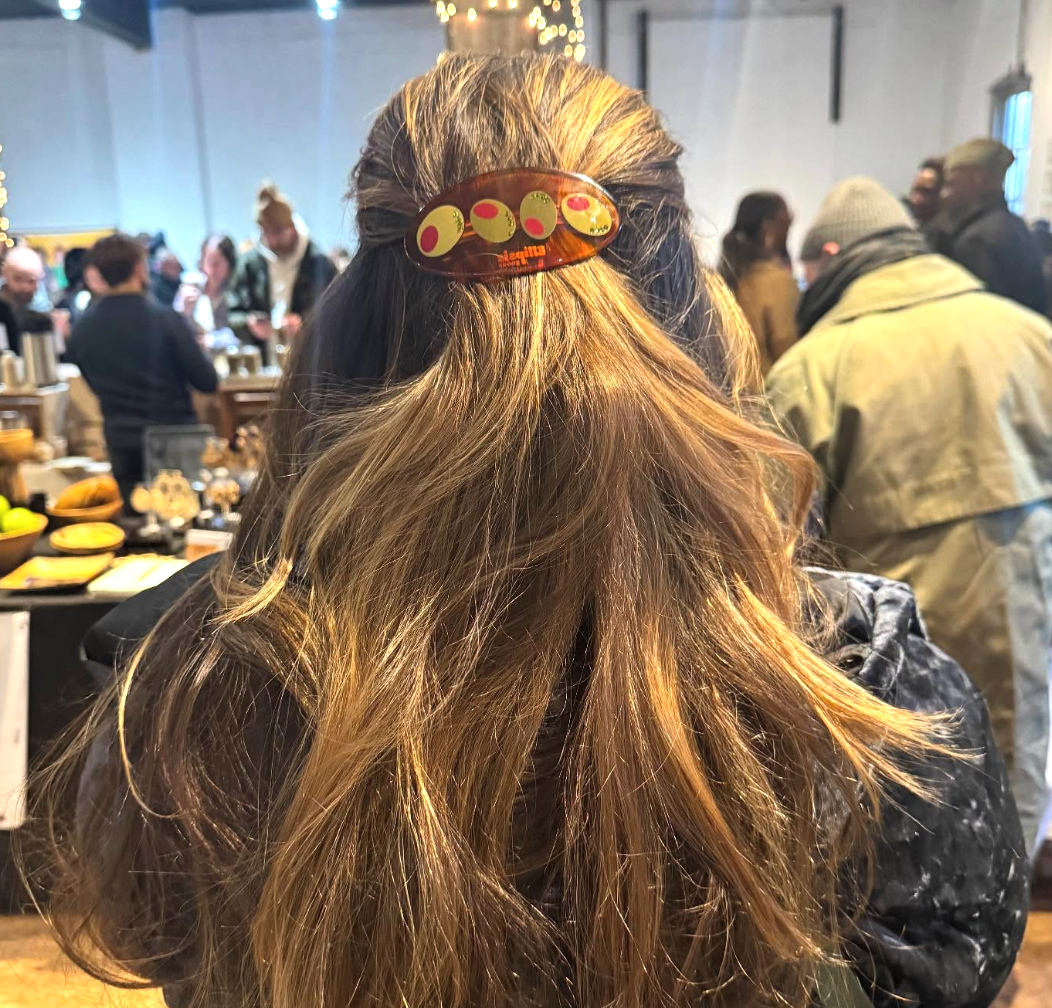 Garnish your look with the chic charm of the Sparkling Olive Barrette.