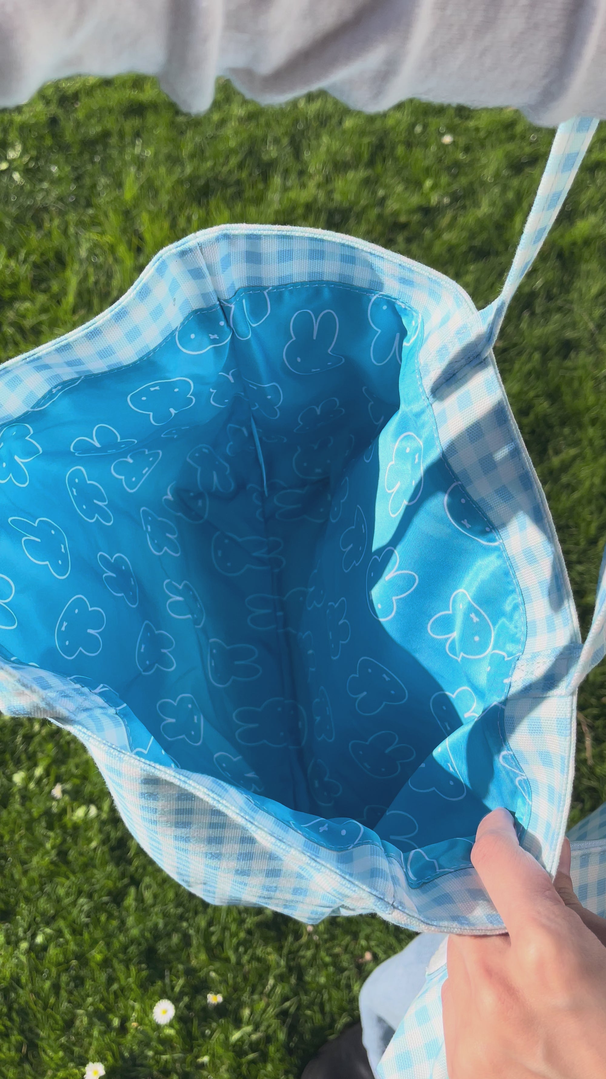 Carry your essentials in adorable style with our blue Miffy Gingham Tote! This small-sized bag features charming fluffy patch detailing of everyone's favorite bunny character. The blue gingham pattern adds a playful pop to any outfit, making everyday errands feel like a mini adventure.